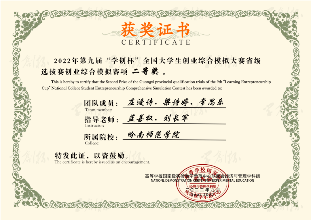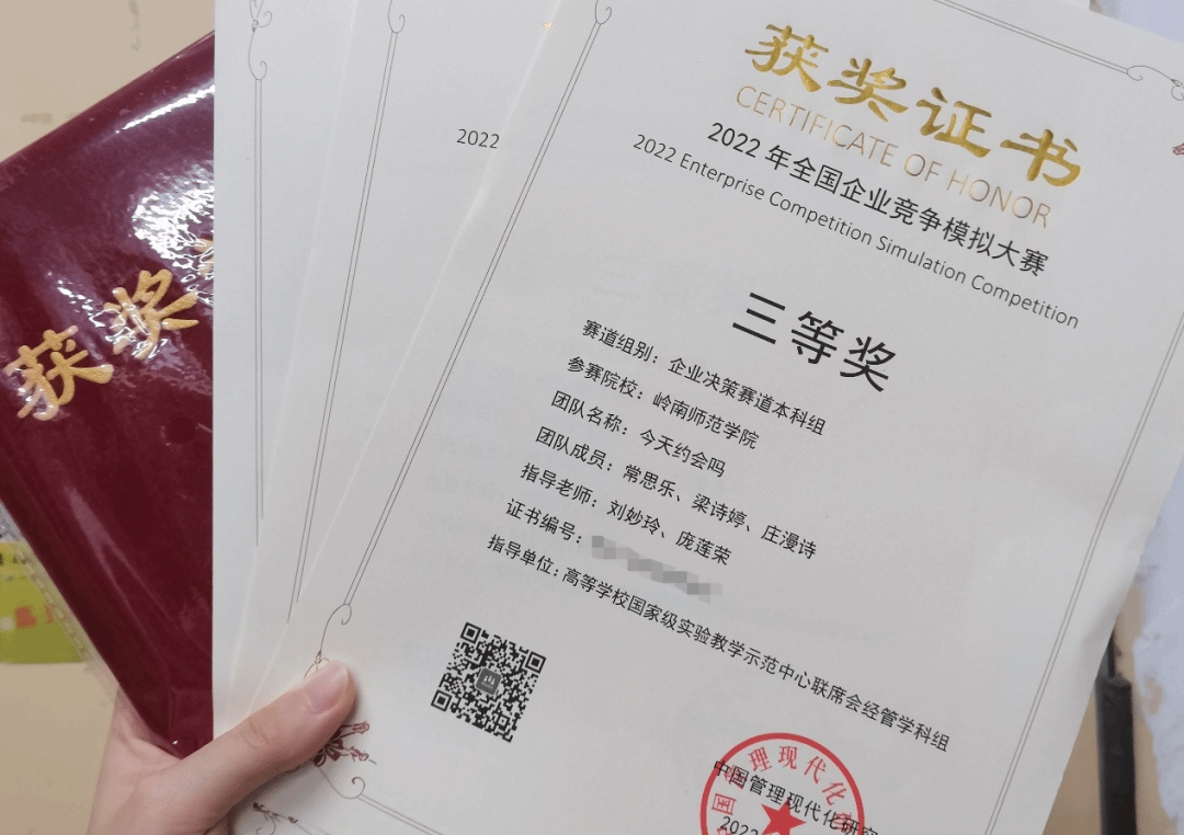 学习之余,我也积极参加各类比赛,截至2022年9月,我已获得企模全国三等奖、三创赛实战赛道省级特等奖等20余项国家级省市校级奖项。