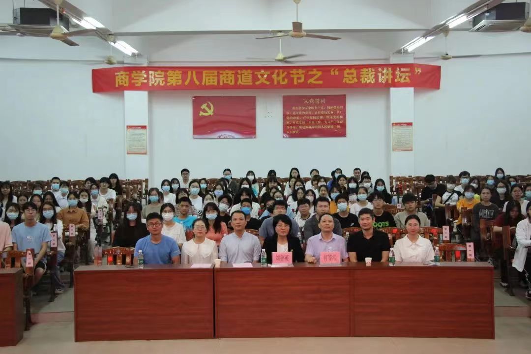 11月12日下午,商学院于弘雷楼211室举办第八届商道文化节之“总裁讲坛”活动。本次活动由广东壹号食品股份有限公司刘鲁英副总裁主讲主讲。商学院党委书记何等浩、工商系正副系主任及工商系全体老师、辅导员谭诗蔚、刘灵瑶出席本次活动。