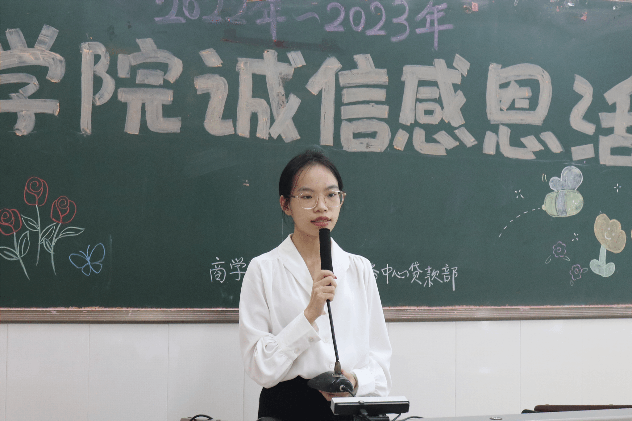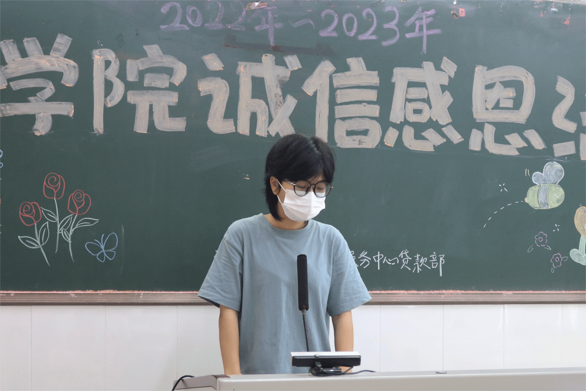自强社干部彭炜运对本次活动进行总结发言。她表示,诚信是立身之本,作为贷款生我们应该诚实守信,按时还款;常怀感恩之心,不负国家的信任,诚实守信,借助国家助学贷款,谱写青春华章。