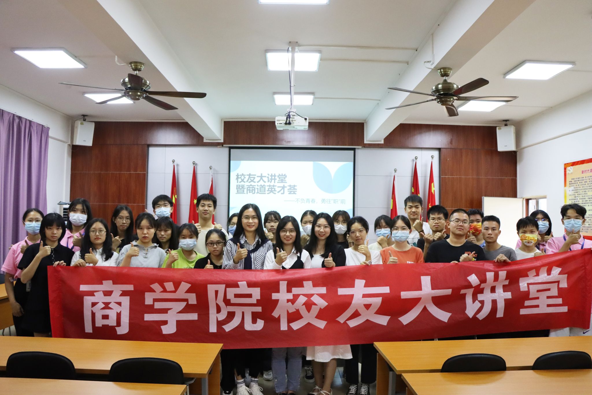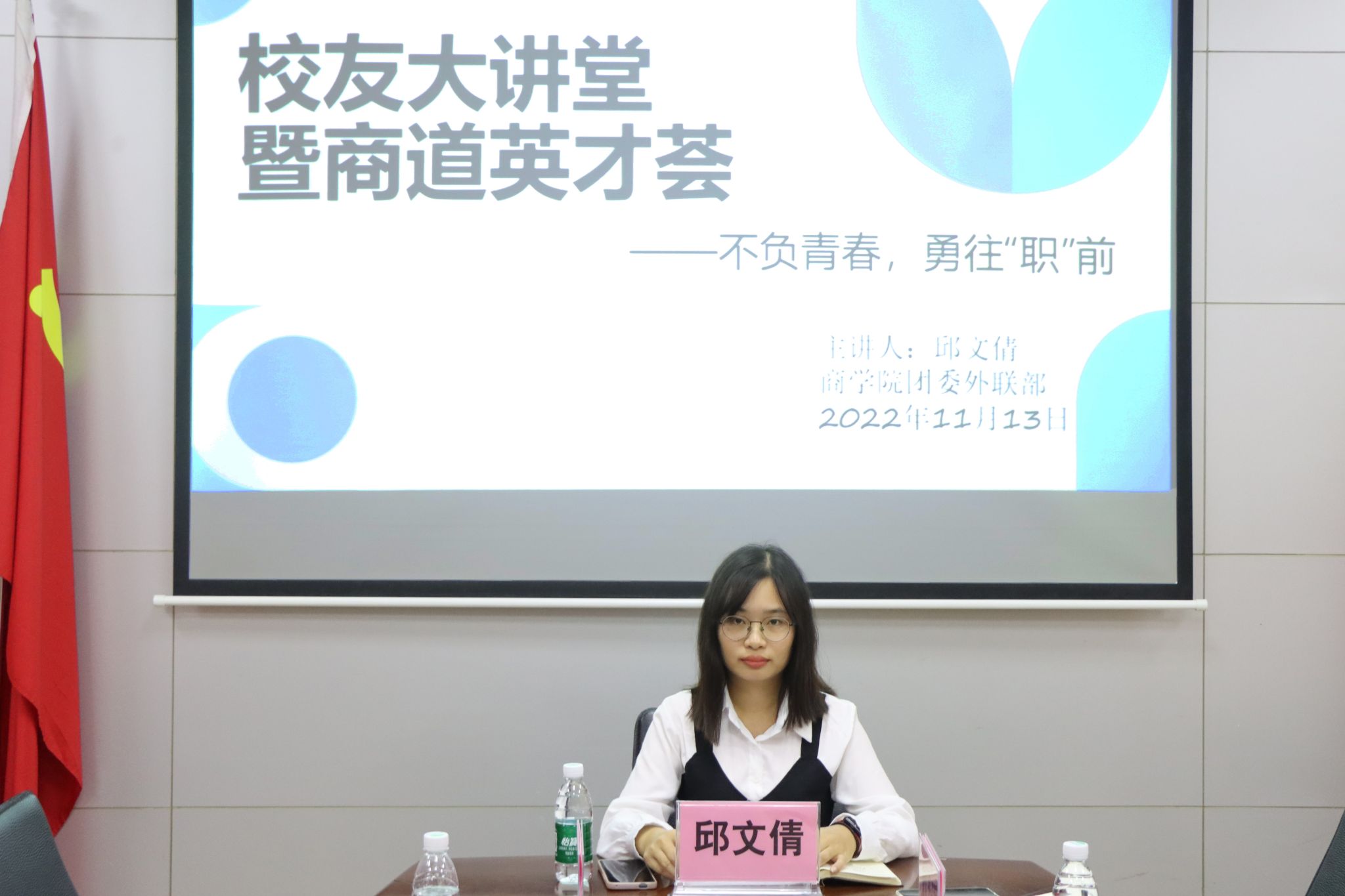 近日,商学院于燕雷楼309室举办校友大讲堂活动,本次活动以“不负青春,勇往‘职’前”为主题,由商学院2018级电子商务专业优秀校友邱文倩主讲,主要围绕学业与就业问题,向同学们展开经验分享。辅导员刘灵瑶、梁海灿出席本次活动。