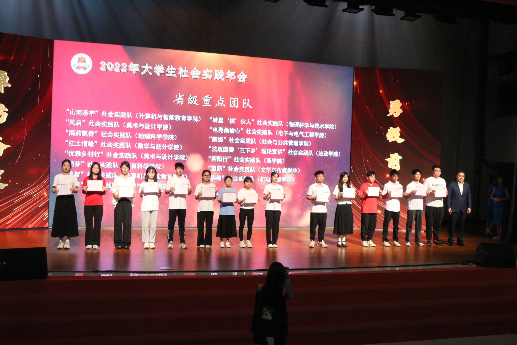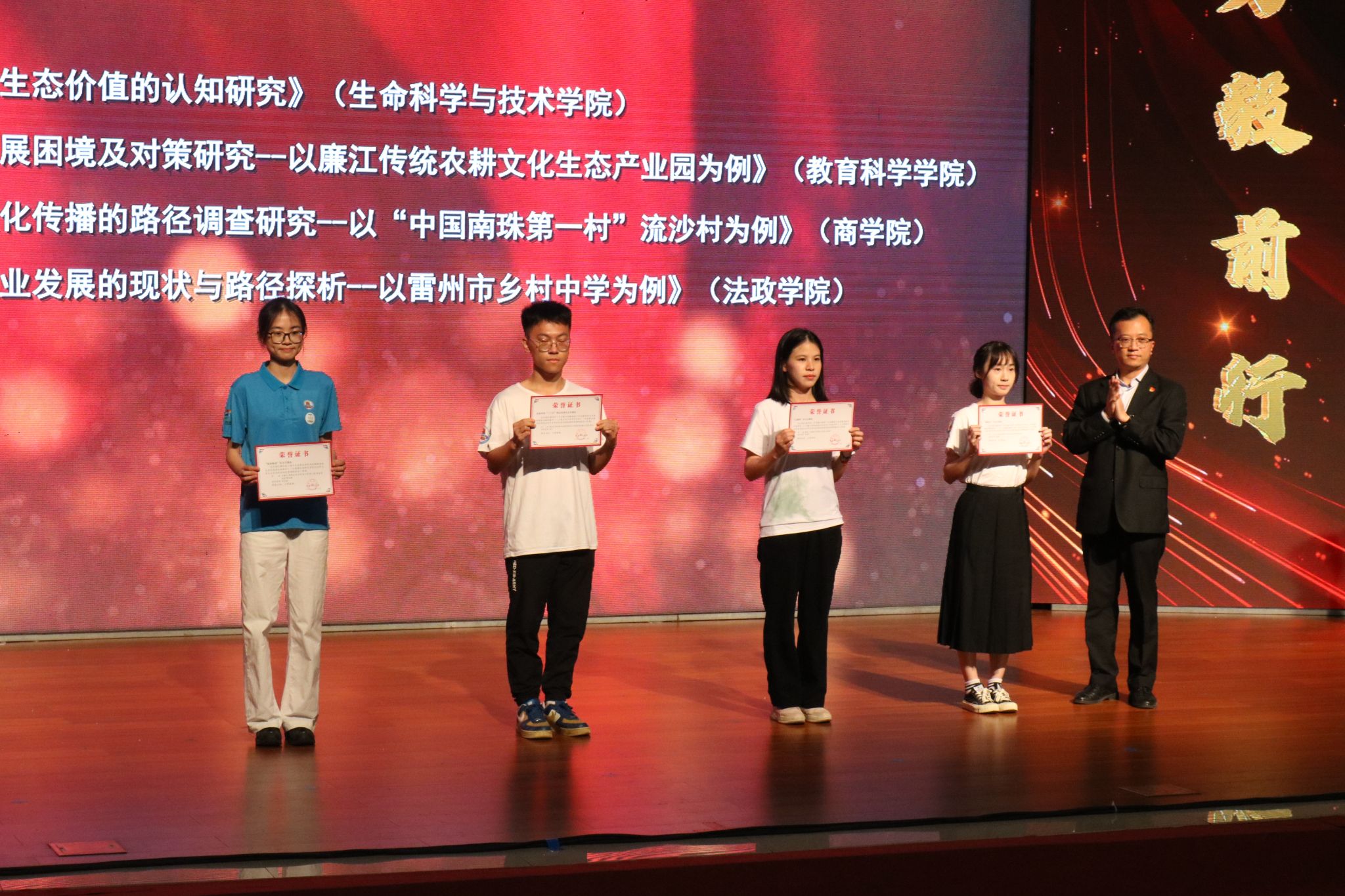 3月19日下午,岭南师范学院于音乐厅举办2022年大学生社会实践年会,对在2022年暑期“三下乡”社会实践活动中表现突出的集体、个人、项目进行表彰。商学院在本次大学生社会实践年会中斩获多项荣誉,其中,《乡村振兴背景下电商助力南珠文化传播的路径调查研究—以“中国南珠第一村”流沙村为例》获优秀调研报告二等奖;商学院“朝阳行”社会实践队获“省级优秀团队”;“飞跃鹰隼”社会实践队获校级优秀团队;周璇获“优秀指导老师”称号:王晓欣等16名学生获“先进个人”;《大学生直播“雷州南珠”,电商赋能乡村振兴》获优秀影像作品。