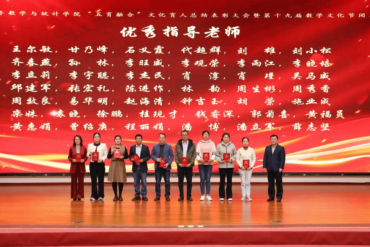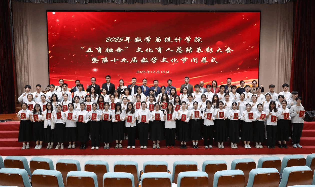 12月14日晚,数学与统计学院于音乐厅隆重举行2025年“五育融合”文化育人总结表彰大会暨第十九届数学文化节闭幕式。学校纪委书记陈健,校友代表,学院班子全体成员、各专业系主任、全体辅导员、学科竞赛优秀指导老师、获奖学生及各班级学生代表齐聚一堂,共同回顾育人硕果,表彰先进典型。大会由学院党委书记叶建仔主持。