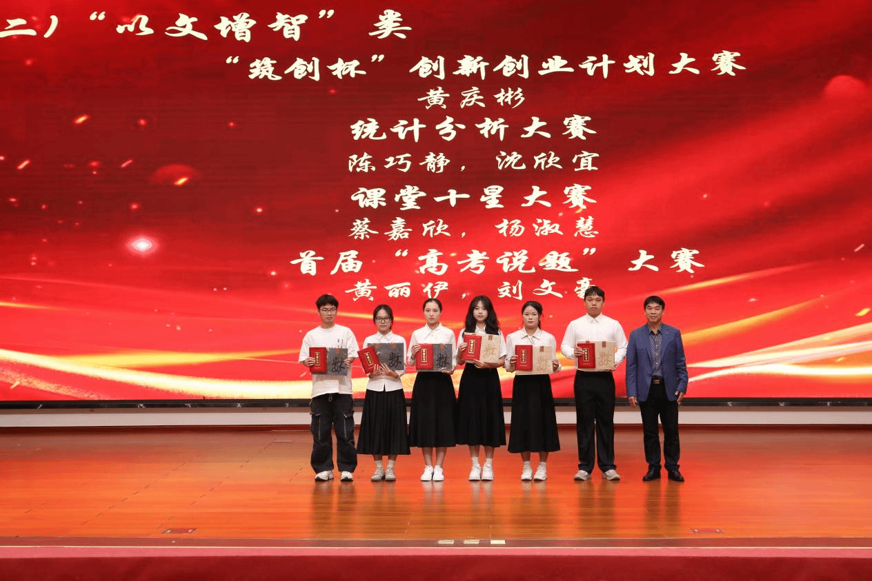 学院党委副书记全光华宣读表彰决定,对43名优秀学科竞赛指导老师、8个先进集体和1171人次先进个人予以表彰。随后,与会领导、校友为获奖代表颁奖。优秀指导老师代表黄福员分享育人心得,优秀学生代表22数本2班庞晓丽、23统计2班刘嘉嘉、23信计1班唐永麟依次登台分享成长感悟。