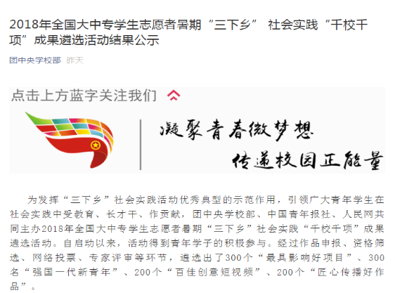 近日,从团中央学校部获奖名单公示获知,我院“曦望”社会实践队脱颖而出,斩获“2018年全国大中专学生志愿者暑期‘三下乡’社会实践‘千校千项’之最具影响 好项目奖”,成为我校今年唯一一支荣获此项殊荣的实力派优秀队伍!