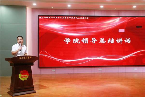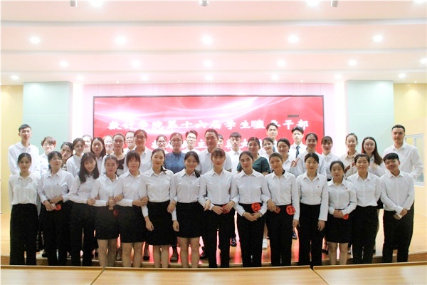 唐副书记为第十五届学生主要干部颁发聘书并发表总结性讲话。他感谢第十五届学生主要干部在过去一年的辛勤付出,并肯定了候选人们充满激情的演讲和自信满满的答辩表现,同时对新一届的学生干部提出要求和工作展望,希望新一届干部能与学院和学校一起决战2019年。