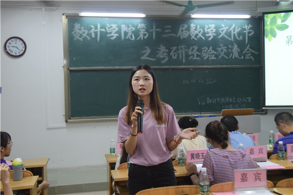 陈海花、吕伟华、陈庆、黄晓玉四位成功考研代表分别从为什么考研、考研的实际情况、如何选择符合自身的考研资料等方面进行了详细的讲解,真诚地与师弟师妹们分享他们考研成功的经验和心得。在互动环节中,同学们踊跃提问,考研成功代表耐心地回答。