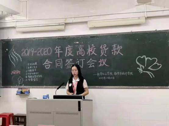 会议上,化学院学生干部何小莹结合PPT做国家助学贷款合同基本要义的讲解,具体地向贷款学生介绍了“核对并填写贷款合同”“核对合同摘要”“支付宝还贷的相关使用”和“贷款生确认并上交资料”等相关助学贷款政策和具体还款流程内容,并指出贷款生应该保持诚信记录,做到诚信还款。