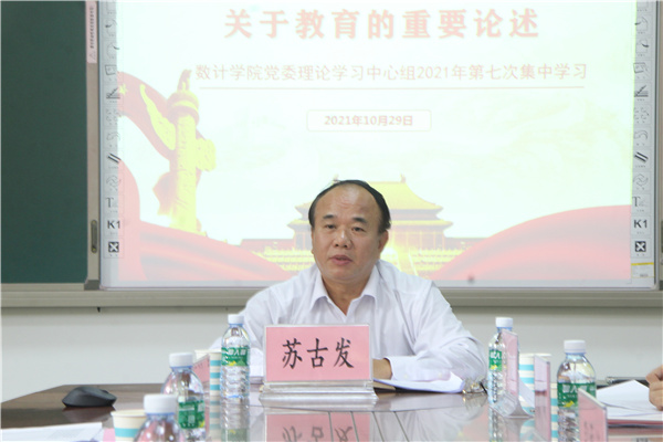 为深入学习贯彻习近平总书记关于教育的重要论述精神,10月29日,我院党委理论学习中心小组于学院会议室召开了2021年第七次集中学习会议。学校副校长苏古发巡听了学习会并作指导讲话,校宣传部副部长郑定、学院党委理论学习中心小组全体成员参加了学习会,会议由学院党委书记李伟主持。