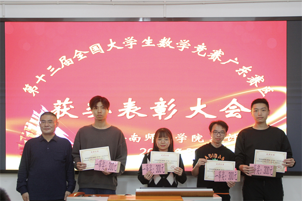 为表彰在第十三届全国大学生数学竞赛(广东赛区)获奖的学生,3月11日下午,我院在榕燕楼二楼学院会议室举行了数学竞赛获奖学生颁奖仪式。出席本次颁奖仪式的有我院于广龙副院长、赵海清主任、欧伯群副教授以及各位获奖学生。