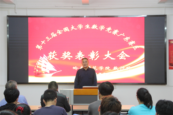 表彰大会上,欧伯群充分肯定了同学们在此次数学竞赛上获得的成绩,他通过对比过去几年我院竞赛的成绩,指出我院创新创业成绩日新月异,成绩傲人,实现了我院竞赛质的突破,并且在省里首屈一指。于广龙介绍了我院为竞赛所做的各项准备,指出此次比赛成绩喜人离不开老师们的辛苦和同学们正确的认识观、价值观及大学生活观,同时也要感谢我院的大力支持,让学生有更多的参与机会。他鼓励同学们更多参与创新创业类比赛,为自己今后的考研、工作等打下坚实的基础。赵海清提醒获奖学生要带动其他同学参与进比赛中来,做好推广工作,形成良性循环。在大会上,于广龙、赵海清和欧伯群向获奖同学颁发证书。