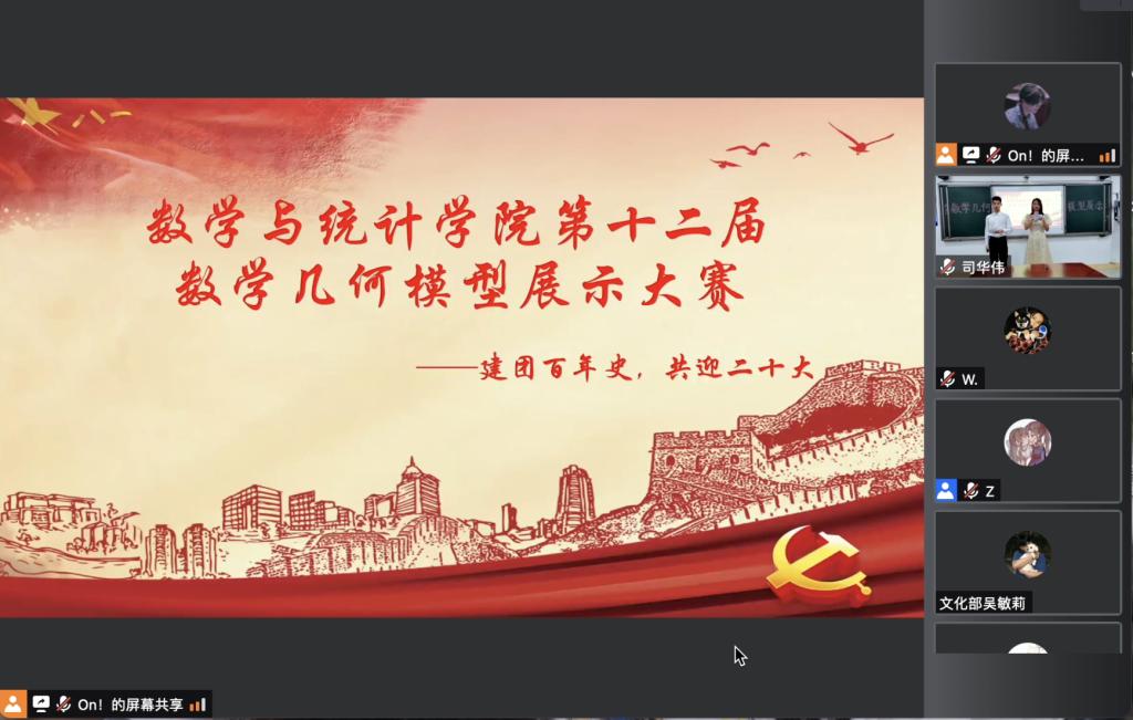 为迎接党的二十大胜利召开,进一步激发同学们的责任感、使命感,让我院学子感受数学文化的深厚底蕴,4月19日上午,我院以线上会议形式举办了以“青春向党喜迎二十大,建团百年奋进新征程”为主题的数学几何模型展示大赛决赛。我院李观荣老师、辅导员代超群、孙士航老师、校团委学生干部以及我院各大机构代表参加了本次大赛。