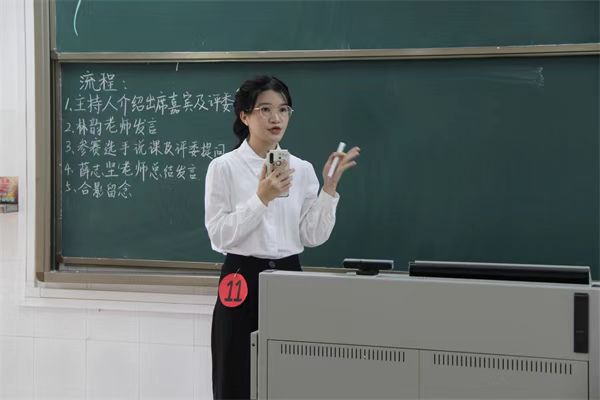 薛老师赛后进行总结。他对各选手的表现给予充分肯定,表扬选手们表达流畅,课件制作精美,板书整洁明了。他指出,选手们要从教态、板书、声调、语言组织和结构化回答问题等方面继续完善,同时,他希望同学们可以通过观看省师范生技能大赛优秀选手的视频表现,更好地提升自我。