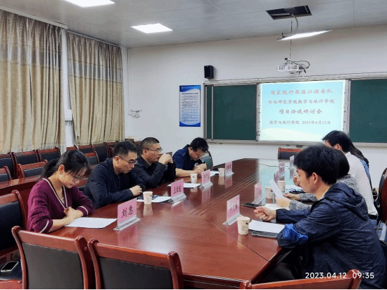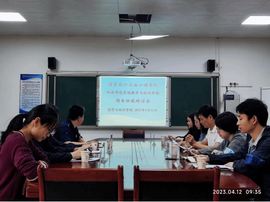 4月12日上午,国家统计局湛江调查队陈日先、吴丽丽两位副队长带队一行五人来我院进行项目洽谈,双方就“农村居民收入结构变动测度及湛江农村居民收入影响因素分析”项目内容、调研和数据采集、项目实施进度安排等细节进行了详细的商讨。会议由学院主管科研的副院长于广龙教授主持,商学院特邀嘉宾王松波副教授,湛江调查队住户调查科周娇科长、邓灵强和吴素婷,统计系主任赵海清、刘惠老师等出席了会议。