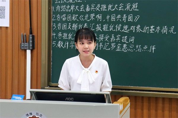 会议伊始,由主持人介绍出席大会的嘉宾及推优大会的流程。会议由全体人员合唱团歌《光荣啊,中国共青团》拉开本序幕。我院2021级、2022级、2023级各支部代表通过PPT展示,从思想、学习、工作和生活等方面介绍了各支部推优候选人的情况。