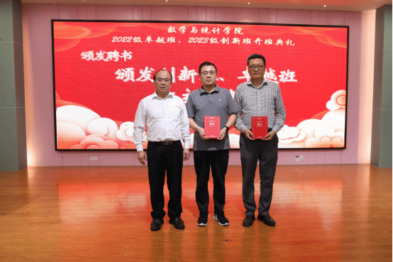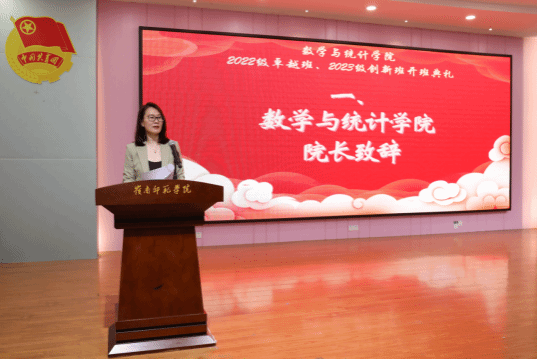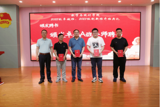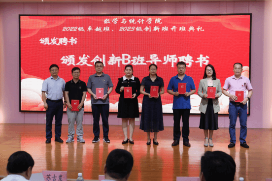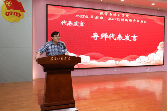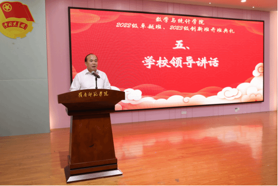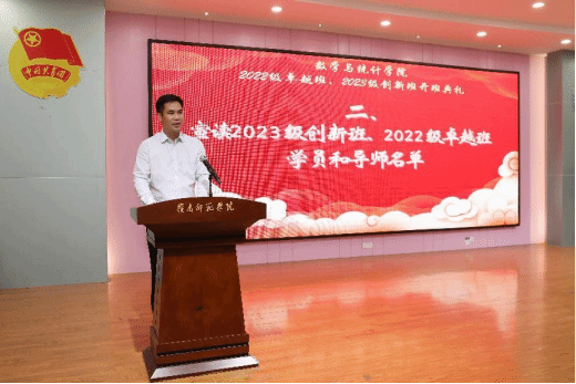 数学与统计学院党委书记叶建仔宣读了入选2022级卓越班、2023级创新班的学员、导师和班主任名单。夏加亮副处长、刘金祥副院长、苏古发副校长分别为2023级创新班、2022级卓越班的导师和班主任颁发聘书。