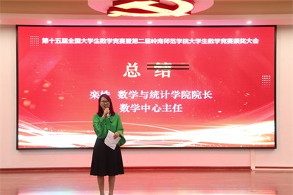 栾姝院长在总结发言中指出,全国大学生数学竞赛和岭南师范学院数学竞赛为学生学习数学注入了新的动力,进一步推动了我校人才培养的高质量发展;学校教务处和创新创业教育学院为竞赛提供了强有力的支持,全校师生的积极参与共同推动了竞赛的圆满成功。她强调,广大青年学生应当以参加数学竞赛为契机,深入认识数学的魅力和价值;鼓励同学们保持热情,继续努力备战即将到来的全国赛,为学校争得更多荣誉。