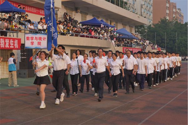 开幕式上精彩纷呈,红旗飘扬,鼓乐齐鸣,舞狮欢腾跳跃。伴随着激昂的进行曲,我院方阵迈着整齐划一的步伐昂首阔步走向主席台,口号“数计数计,齐心协力,斗志昂扬,再创辉煌”响彻雷阳田径场,这是团结与力量的凝聚,是对胜利的渴望与追求,彰显出青春无畏、拼搏奋进的精神风貌。