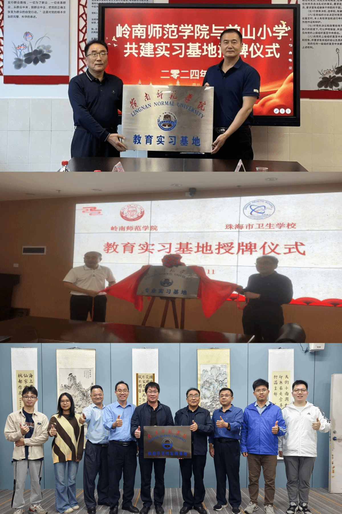 学院吴勇旗副院长分别与前山小学、珠海卫生学校和广州南沙潭山中学举行了“教育实习基地”授牌仪式。各校领导和教师代表进行了合影留念,共同见证了这一重要时刻。在教育实习领域的合作迈入了新的阶段,双方将携手培养更多优秀的教育人才。