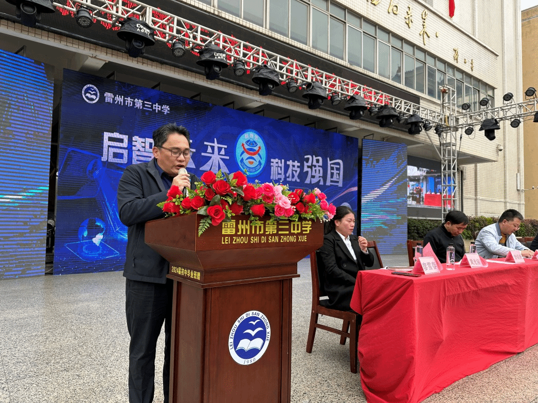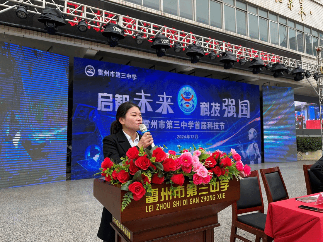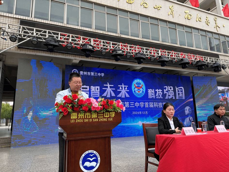 在开幕式上,雷州市教育局副局长官腾达发表讲话,对雷州三中首届科技节的成功举办表示祝贺,并对岭南师范学院数学与统计学院、计算机与智能教育学院、机电学院师生团队的帮扶表示感谢。他指出,科技是未来发展的核心动力,科技节不仅是学生展示创新成果的平台,更是推动雷州教育信息化和创新发展的重要契机,希望全体师生珍惜机会,激发创新潜能,为雷州教育事业的高质量发展贡献力量。