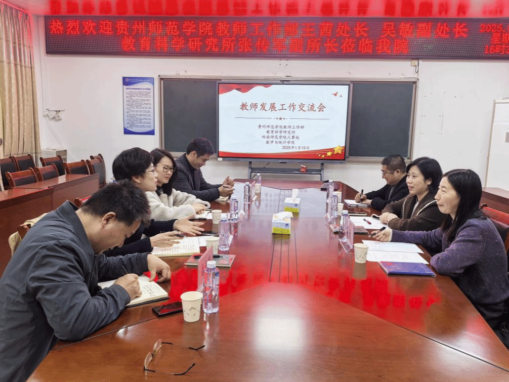 2025年1月15日,贵州师范学院教师工作部处长王茜、副处长吴敏,教育科学研究所副所长张传军到数学与统计学院围绕教师发展工作交流座谈。学校人事处副处长温笑薇、数学与统计学院党委书记叶建仔、院长栾姝、统计系主任赵海清参加本次座谈会,会议由栾姝主持。
