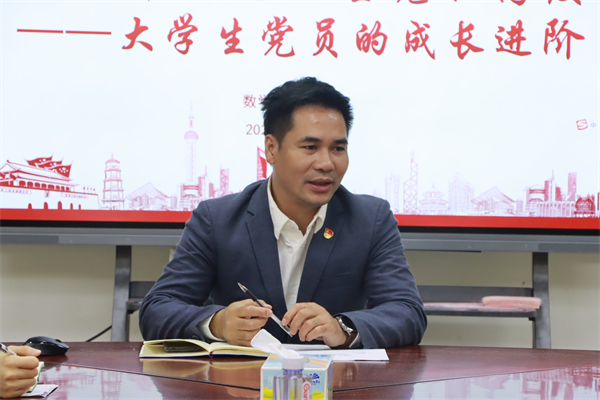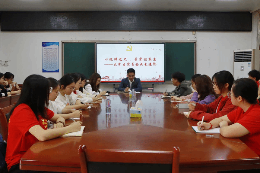 随后,叶建仔深入分析纪律与党性的内在联系,指出纪律是党性的外在表现,党性是纪律的内在支撑。他既肯定了大学生党员遵守纪律、发挥先锋模范作用的积极行为,也剖析了存在的问题。针对如何以纪律为尺提升党性,他提出三点建议:一是要加强纪律学习;二是要注重日常行为规范;三是要坚持自我监督与反思。最后,叶建仔鼓励大家要将纪律意识和党性修养融入日常的学习、工作和生活,以高标准严格要求自己,为实现中华民族伟大复兴贡献青春力量。