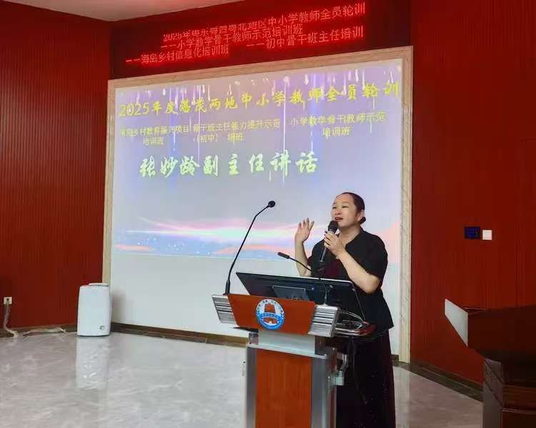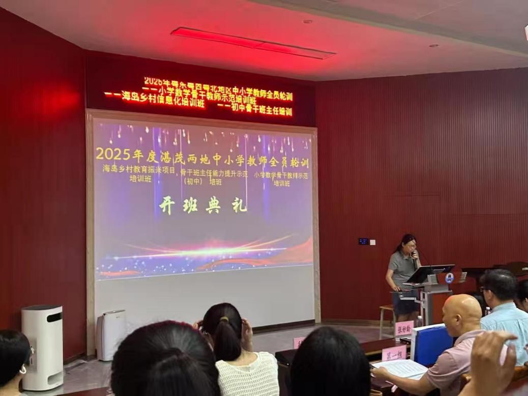 2025年5月23日,由岭南师范学院数学与统计学院承办的粤东粤西粤北地区中小学教师全员轮训项目——骨干班主任能力提升示范培训项目、海岛乡村教育振兴培训项目、小学数学骨干教师示范培训项目在岭南师范学院榕楼105举行了开班典礼。岭南师范学院数学与统计学院院长栾姝、岭南师范学院省级中小学教师发展中心副主任张妙龄、各项目负责人、班主任及全体学员参加了开班典礼。开班典礼由数学与统计学院李雨江老师主持。