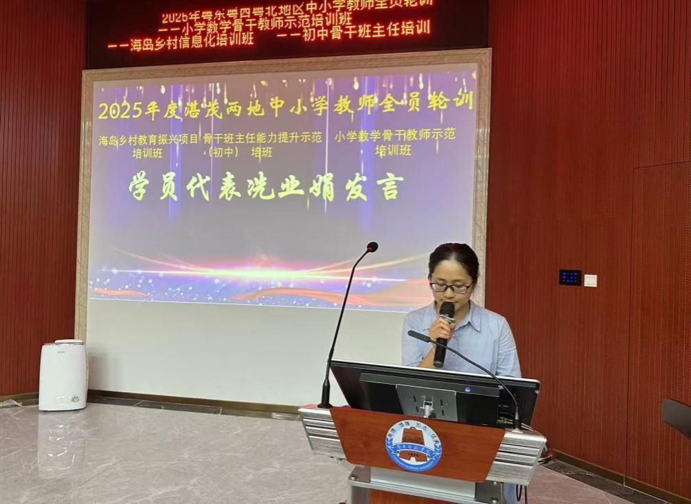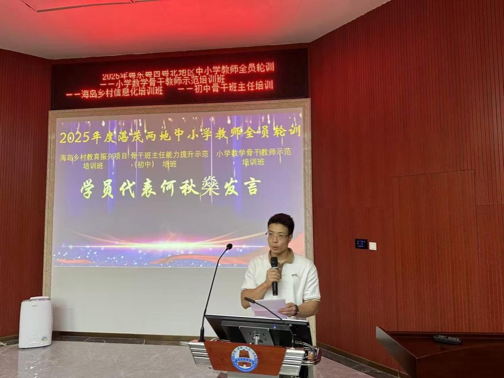 最后,骨干班主任能力提升示范培训班、小学数学骨干教师示范培训班和海岛乡村教育振兴培训班的学员代表依次上台发言。他们感谢学校、学院为他们提供宝贵的学习机会,并表示作为中小学校教师,深知自己的职责和使命,希望通过此次培训,进一步提升教学能力、教研能力和班主任工作能力,并将所学知识应用到今后的教学实践中,为粤西的基础教育作出更大贡献。