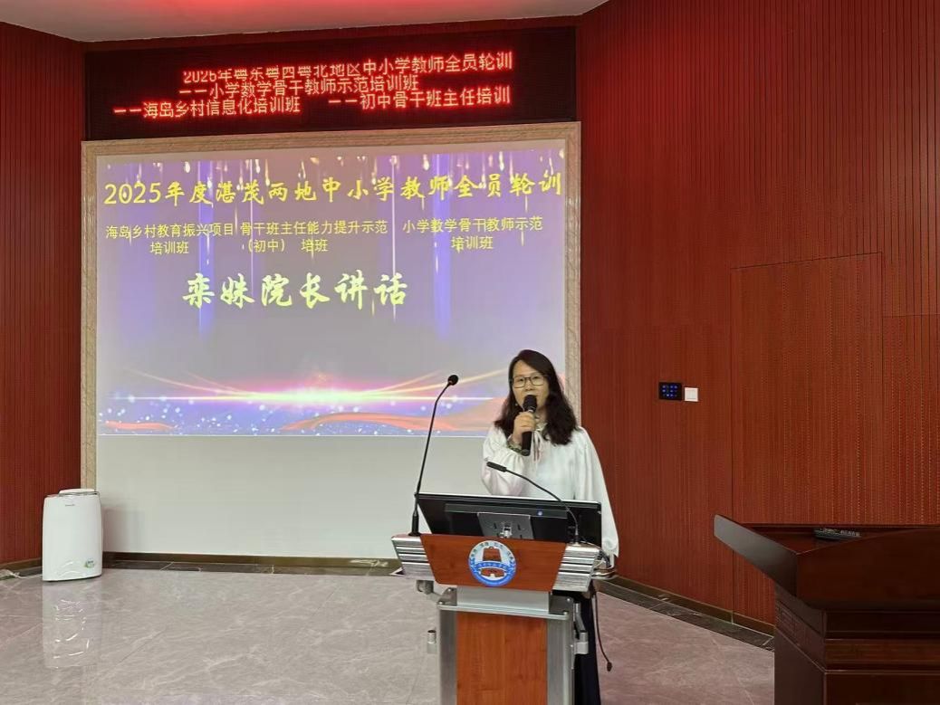 首先,数学与统计学院栾姝院长代表学院对各位学员的到来表示热烈欢迎,并简要介绍了数学与统计学院的发展情况。她介绍,数学与统计学院拥有较雄厚的师资力量和丰富的教师培训经验,近年在基础教育研究、教师教育改革和基础教育帮扶等领域取得丰硕成果,为此次轮训项目的顺利开展奠定了坚实基础。她指出,此次培训不仅邀请了多位教育领域的专家学者授课,还设计了丰富多彩的实践活动和互动环节,旨在帮助学员们更好地掌握现代教育理念和教学方法。她强调,学员们应珍惜这次难得的学习机会,积极参与,深入交流,提升自我,并以此次培训为新起点,带动更多教师共同成长,为粤西地区教育事业高质量发展贡献力量。