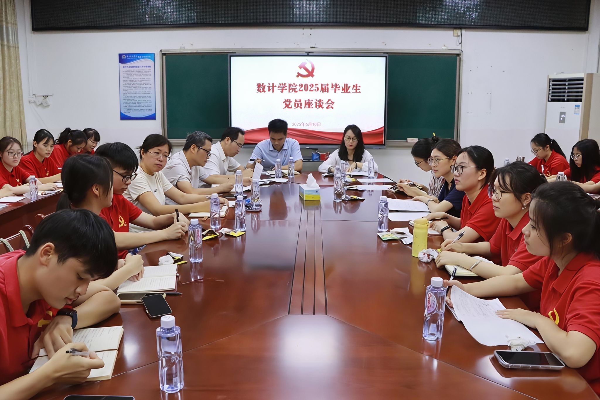 为搭建毕业生沟通交流平台,广泛听取同学们对学院发展的意见建议,6月10日下午,我院于榕燕楼二楼会议室举办2025届毕业生党员座谈会。我院党委书记叶建仔,院长栾姝,党委副书记全光华,数学系主任李观荣,统计系主任赵海清,计算科学系主任周秀香,辅导员林韵、张嫣及2025届毕业生党员参加了本次座谈会,会议由全光华主持。