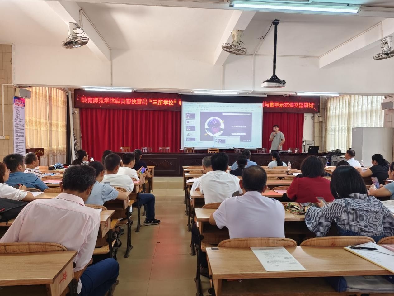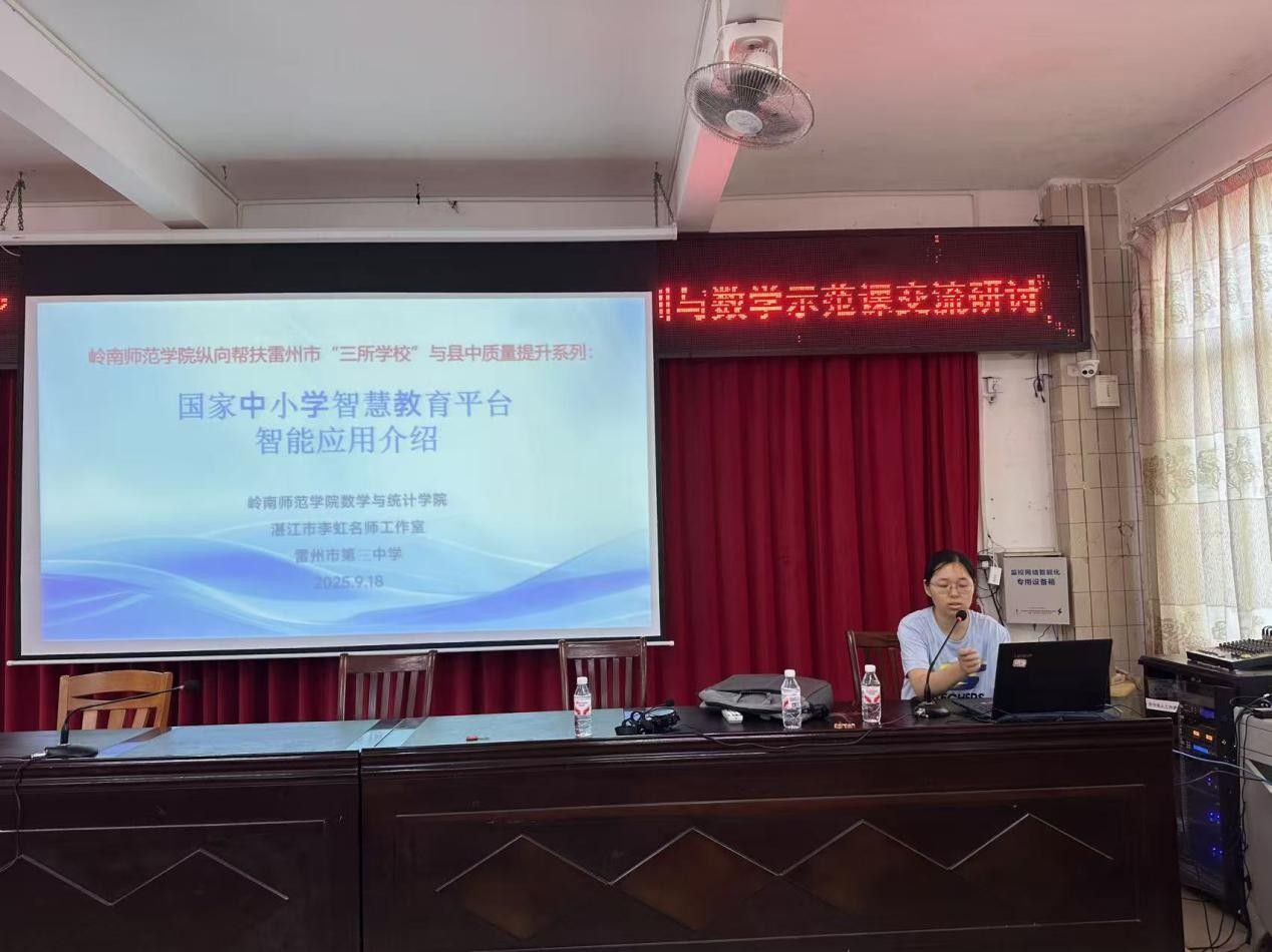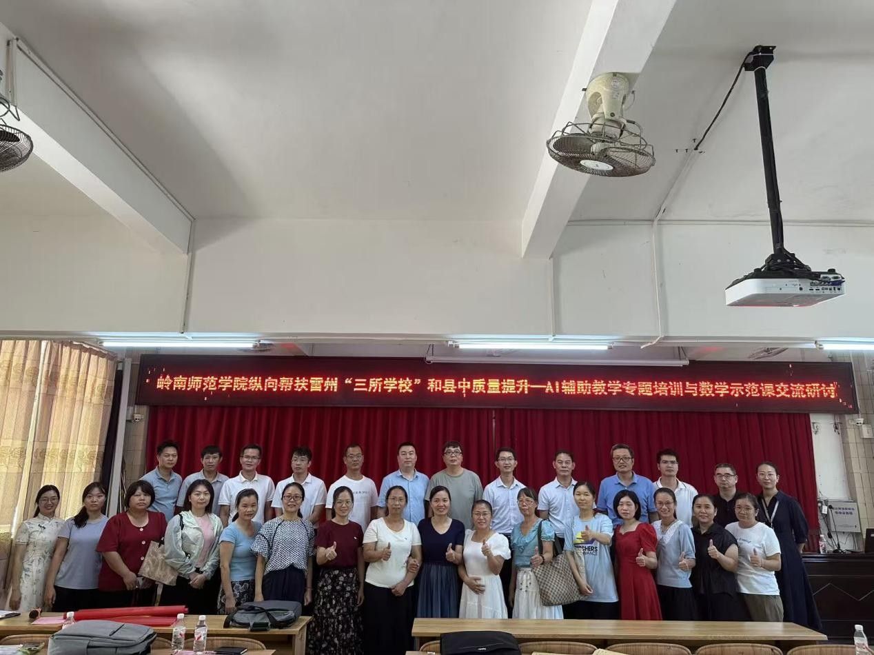 9月18日,帮扶团队分别在雷州市第八中学和第三中学举办了“AI辅助教学专题培训”和“数学示范课交流研讨”,我院李雨江老师和徐鹏老师分别作了专题报告《国家中学智慧教育平台——智能应用介绍》和《人工智能在教育中的应用》,湛江市李虹名师工作室主持人李虹及成员王娟分别上数学示范课《有理数的加法》和《二次函数图像的性质》。来自雷州一中、二中、三中、八中、纪家中学、客路镇第二初级中学及附城镇中心小学250多名教师参与培训和示范课交流研讨,与会教师纷纷表示讲座与示范课启发性强,对AI赋能教学的理念与方法有了更深入的理解,对提升自身课堂教学质量获益匪浅。另外,岭南师范学院教师发展与教学质量测评中心副主任李子深在雷州三中作《高中英语突破专题讲座》,助力提升雷州三中英语教师的教学水平与学生英语学习能力。