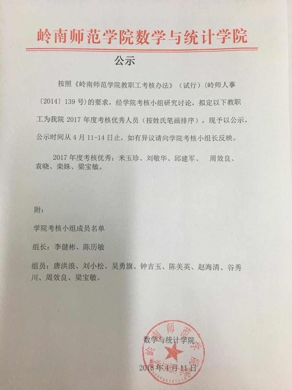 学院2017年考核结果公示