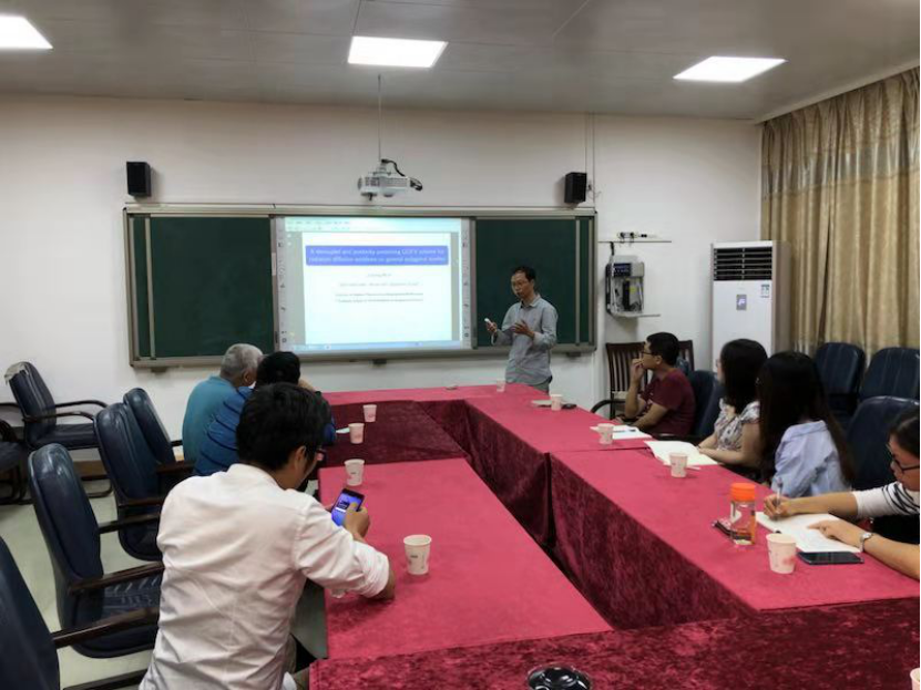 报告会上,邬吉明研究员介绍了计算方法数值模拟问题时保持原问题真解性质的重要性以及目前国际上基于任意多边形网格剖分的数值算法的研究现状,并讨论了自己在辐射扩散问题的基于任意多边形网格的DDFV方法的保正性方面的研究。