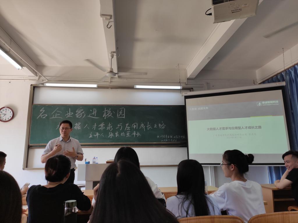 2019年9月,我院邀请了岭南师范学院附属中学林文良教授和广东泰迪智能科技股份有限公司董事长张良均高级工程师分别为数学与应用数学和统计学专业高年级学生开展专题讲座。