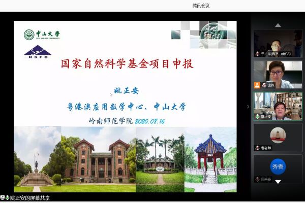 2020年8月16日上午,应我院邀请,广东省数学会理事长、中国数学会常务理事、国家重大研究计划指导专家、科技部 973项目骨干成员、国家自然科学基金项目会评专家中山大学姚正安教授为我院作基金申报专题报告。报告会在腾讯会议进行,由学院主持行政全面工作的副院长栾姝主持,学院党委书记李伟、吴勇旗和于广龙两位副院长、各系主任以及部分老师参加了本次会议。