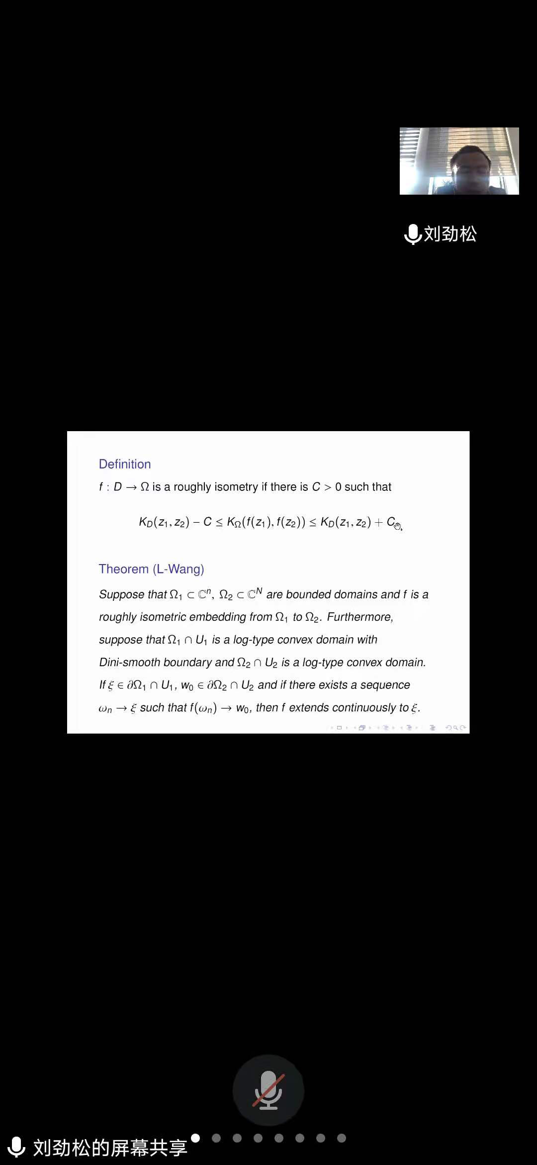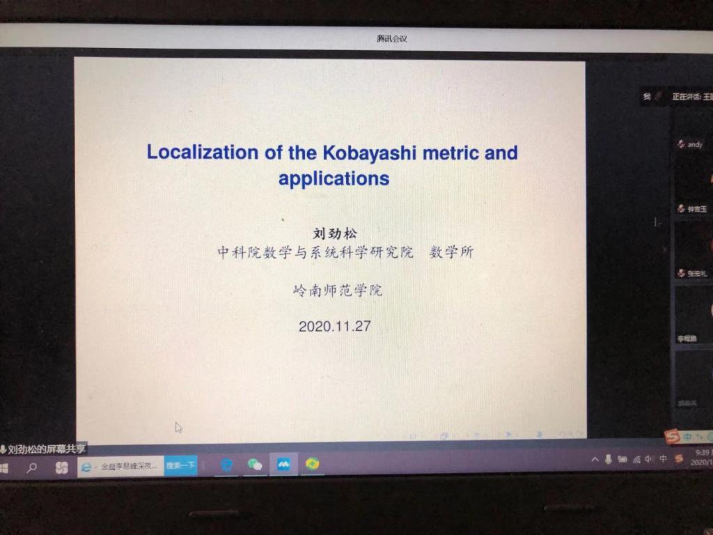 刘劲松研究员的报告题目是《Localization of the Kobayashi metric and applications》。报告中,刘研究员介绍了一类新域,即边界非正则的对数凸域;阐述了对数子凸域上Kobayashi度量的局部刻画,作为应用,证明了Teichmuller 空间 T_g 不能全纯同胚C3g-3临近边界点对数凸的有界拟凸域。报告会内容十分丰富,结论深刻,贯穿多复变和单复变的前沿课题,反例信手拈来,是一场高水平的学术盛宴。最后报告会互动环节,刘研究员和与会老师就对数凸域在Teichmuller空间中的应用进行了热烈讨论。整场报告,精彩纷呈,让与会老师大开眼界,受益匪浅。