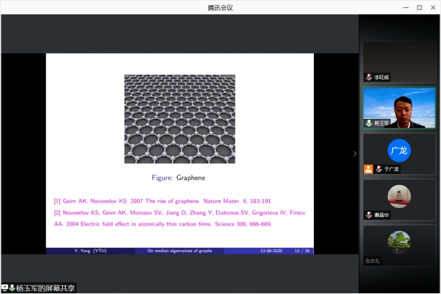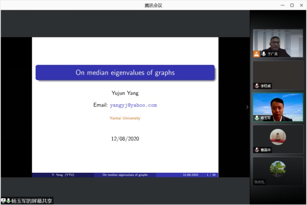 杨玉军教授的报告题目是《On median eigenvaules of graphs》。在报告中,杨玉军教授对课题相关问题背景和成果进展做了总结性的回顾,也介绍了自己课题组在该领域的研究成果与贡献。报告内容非常丰富、深入浅出。在报告中,杨玉军教授和与会老师积极就课题涉及的相关问题进行了深入广泛的思想和方法互动交流。整个报告会过程环环相扣,非常精彩。