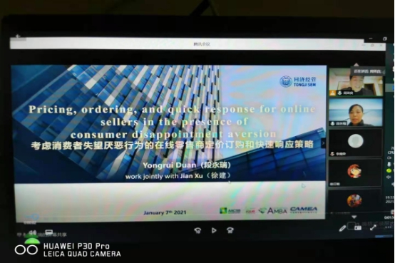 2021年1月7日,应我院校级重点学科(数学)邀请,同济大学经济与管理学院管理科学与工程系博士生导师段永瑞教授为我院师生作了一场在线学术报告。段教授报告的题目是《消费者的失望厌恶情绪对网上卖家的定价、订货和快速反应决策的影响》。她从当前网络销售热点出发,针对消费者和卖家这一对买卖关系的两方面,在考虑消费者的失望厌恶情绪以及卖家可以采用部分覆盖策略或全覆盖策略进行合理深入的分析,然后建立恰当的数学模型,通过对模型的分析求解,最后给出卖家的销售策略。