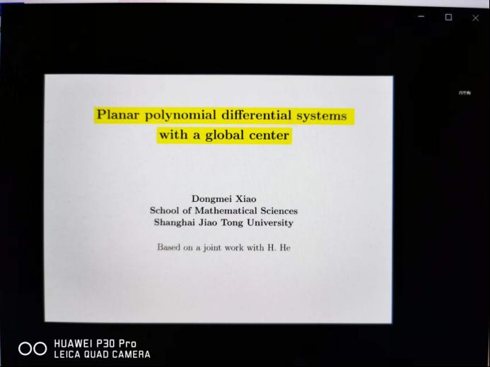 肖冬梅教授作了题为《Planar polynomial differential systems with a global center》(具有全局中心的平面多项式微分系统)的报告。肖教授首先介绍了国际上平面系统周期解的研究状况,然后介绍具有全局中心的平面多项式微分系统的刻划,指出系统的每一个轨道都是平面上的周期轨道,详细阐述了她们团队在有全局中心的势系统和列纳德系统的代数充要条件的最新结果。最后,指出了一些相关公开问题。