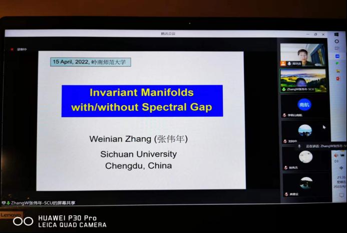 张伟年教授作了题为《Invariant Manifolds with/without Spectral Gap》(有或无谱间隙的不变流形)的报告。张教授首先从中心流形的基本概念出发,讲解了中心流形、中心子流形以及流形的近似等概念和方法。然后讨论了在有或没有光谱间隙条件下得到的不变流形,给出了弱双曲流形(有间隙条件)的近似,并给出了中心流形(无间隙条件)上不变子流形的存在性和光滑性一些研究成果。