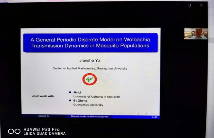 庾建设教授作了题为《A General Periodic Discrete Model on Wolbachia Transmission Dynamics in Mosquito Populations》(蚊子种群沃尔巴克氏体传播动力学的广义周期离散模型)的报告。庾教授首先从人类受自然界生物带来疾病的历史讲起,然后着重讲解蚊子给人类传播的疾病以及生物数学家近百年来的科学研究状况。接着,庾教授详细阐述了他们团队近十年来在蚊子种群沃尔巴克氏体传播动力学方面的研究成果,特别介绍了在国际顶级期刊《Nature》上发表的研究成果和方法。最后,庾教授给出了一些尚未解决的公开问题,鼓励和希望年轻人在此领域能合作研究获得更好成果。