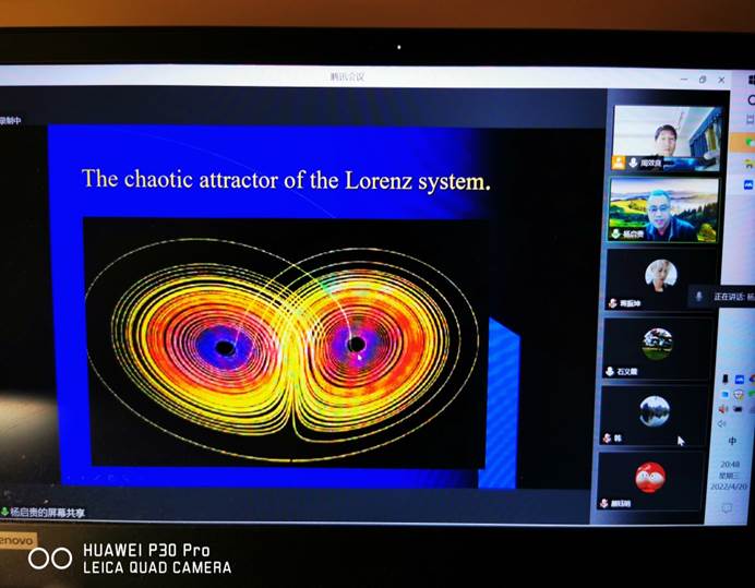 杨启贵教授 《Chaotic vibrations of 3D linear hyperbolic PDEs with linear perturbations of superlinear boundary conditions》(具有超线性边界条件线性扰动的三维线性双曲偏微分方程的混沌振动)。杨教授介绍了在国际上三维空间中由线性双曲型偏微分方程控制的无限维动力系统的混沌振动,其中边界条件包括两个超线性型的线性摄动研究情况。分享了他们团队在保证此类系统发生混沌获得的数学定理。最后阐述了现有混沌向三维双曲偏微分方程的发展和研究前景。
