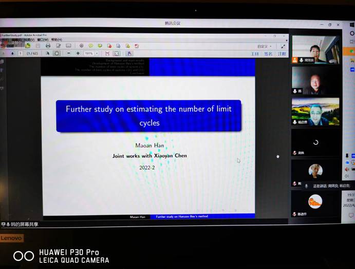 4月20日晚,应重点学科(数学)邀请,浙江师范大学韩茂安教授、华南理工大学杨启贵教授在线为我院重点学科(数学)团队成员作了精彩的学术报告。我院副院长栾姝教授首先致欢迎词,同时介绍了我院的学科概况和发展目标。报告会由重点学科负责人周效良教授主持。