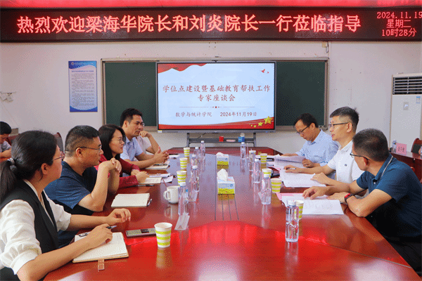为全力推动我院学科建设及基础教育帮扶质量提升,扎实推进学院学位点建设相关工作,11月19日上午,我院于榕燕楼会议室召开学位点建设暨基础教育帮扶工作专家座谈会。广东技术师范大学数学与系统科学学院院长梁海华、广东金融学院金融数学与统计学院院长刘炎、华南师范大学体育科学学院主任朱华超以及我院党委书记叶建仔、院长栾姝、副院长于广龙、数学系主任李观荣、统计系主任赵海清、计算科学系主任周秀香及学位点骨干成员参加本次会议。会议由栾姝主持。