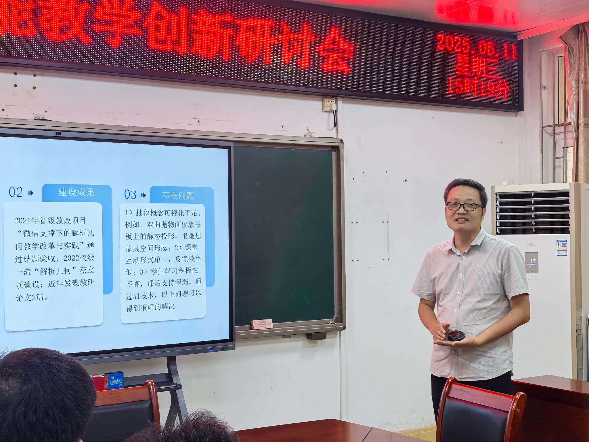 会议伊始,李观荣副教授以解析几何课程为例,从备课、课堂教学、课后作业等六个方面,分享 AI 驱动下的课程教学创新实践,为教师提供可借鉴的经验;