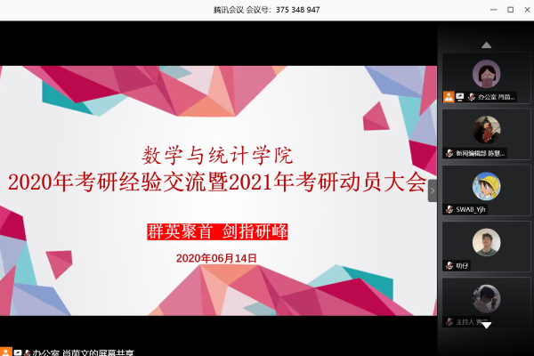 614日下午,我院利用腾讯会议在线上举办了考研经验交流暨动员大会。参加此次考研交流会的有学院6位考研成功代表、大二、大三有意愿考研学生,学院刘小松老师、吴克俭老师、欧伯群老师、栾姝老师、赵海清老师、钟吉玉老师、辅导员林韵老师出席此次会议。