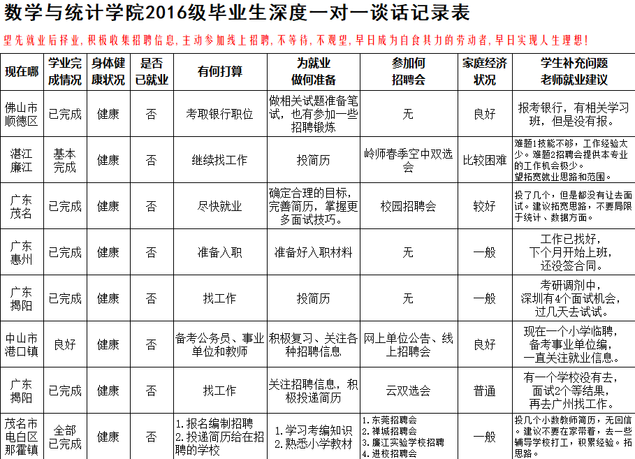提供靶向服务,增强服务能力。辅导员每周都会在网上搜集大量招聘信息,细心整理后发给毕业班学生。辅导员班主任也督促学生关注学校就业公众号“岭南师院就业”,主动参加网上招聘会,扩大简历的投递范围,同时根据前期摸查的学生求职意愿,有针对性地推荐就业岗位,并跟进学生投递简历情况,帮助分析和指导学生参加笔试或面试。