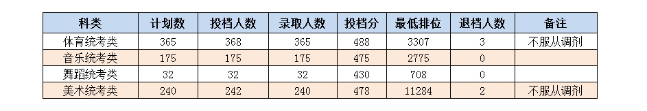我校2020年广东省本科批体育艺术类统考专业于2020年8月14-15日投档录取,所有专业均第一志愿满档。各类投档最低分分别为:体育488分、美术478分、音乐475分和舞蹈430分。有5名考生因不服从专业调剂无法录取所报专业而退档。现将我校体育艺术类统考投档录取情况公布如下: