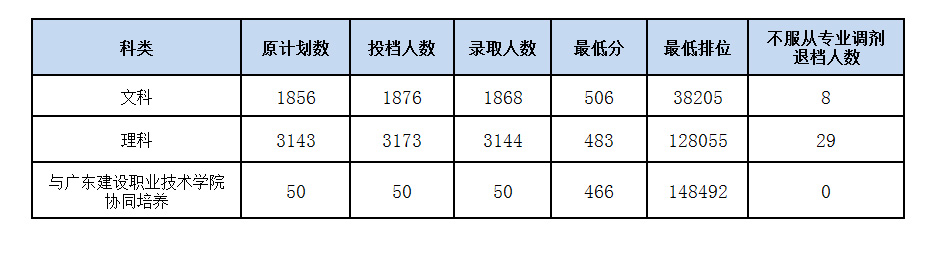 另,我校与爱尔兰高威-梅努斯理工学院开展中外合作办学招生专业烹饪与营养教育在省内计划招生50人,投档40人;我校与广东建设职业技术学院开展四年制(2+2)本科协同育人项目实验班(招生代码:80035)计划招生50人,投档50人,投档最低分466分(最低排位148492),录取50人。