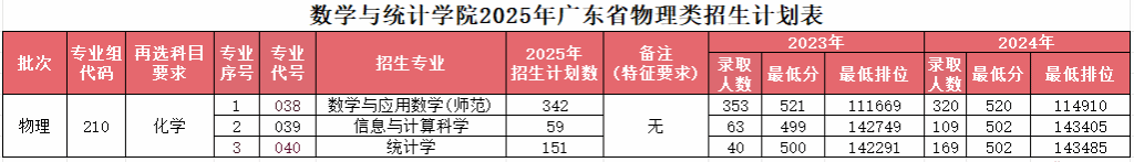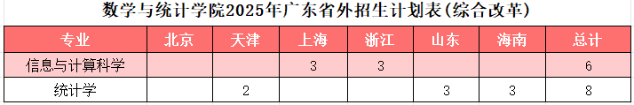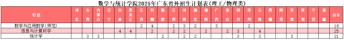 其中,数学与应用数学(师范)专业广东省招生计划342人,省外18人,合计360人;信息与计算科学专业广东省招生计划59人,省外31人,合计90人;统计学专业广东省招生计划151人,省外29人,合计180人。