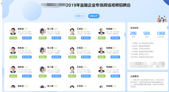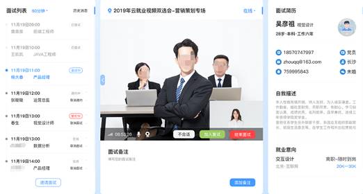 审核通过后,单位PC端参会。招聘会当天PC端进入报名的双选会会场→单位登录→进入视频面试间→面试列表中选择在线求职者,点击“立即沟通”→进行视频沟通。更多人才需求可提前点击“去邀约面试”进入人才大厅邀约,邀约被同意后即可面试。视频挂断后,单位给出面试结果“合格”或者“不合格”,以及相关备注,以便后续查看。